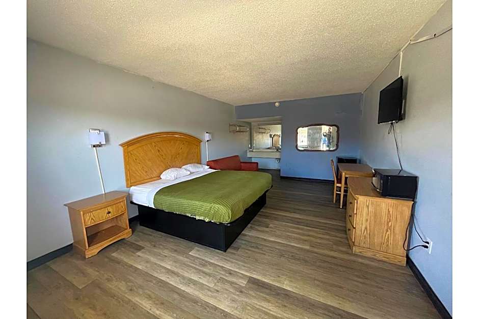 Room options include a King Room with a kitchenette (non-smoking, about 151 sq ft, one king bed) for a cozy, self-contained stay. Additional configurations feature two double beds in both non-smoking and smoking options, plus larger 2 Full/2 Double layouts, with some smoking allowed.